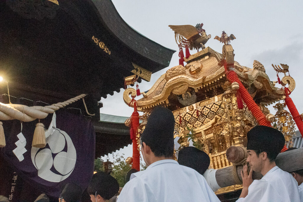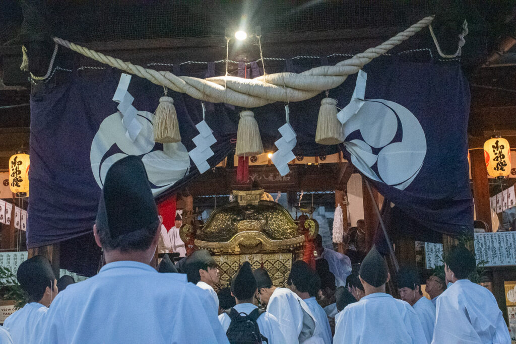 御旅所へ出発する直前、神輿を囲む神職たち。黄金の輝きが夕暮れに映える。