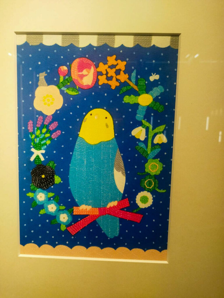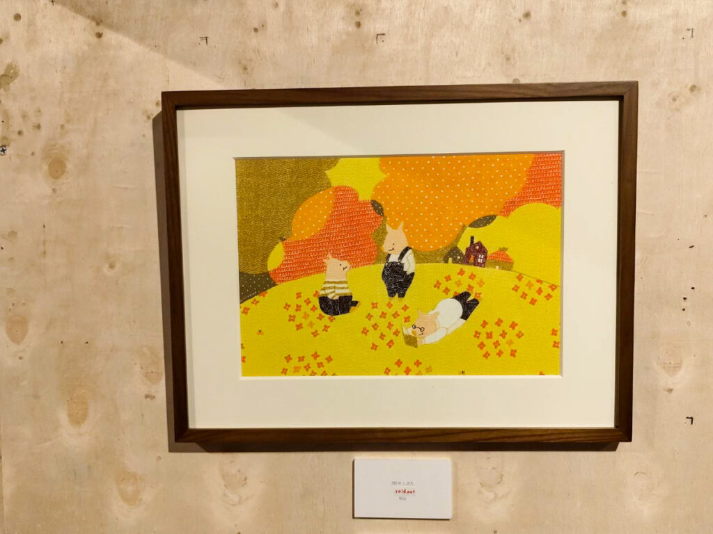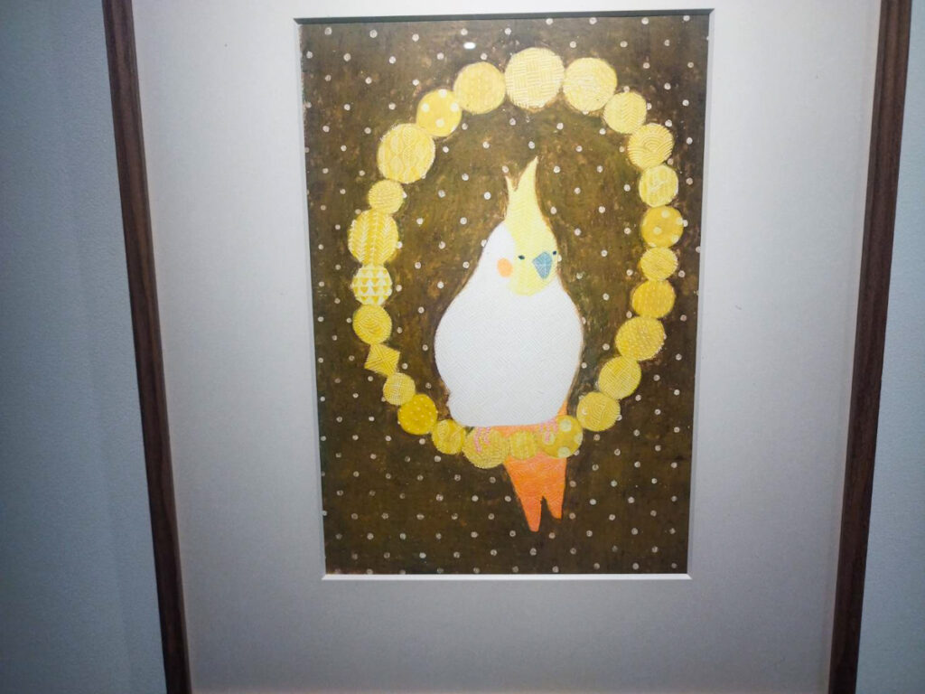 やさしい色と線で描かれた鳥や猫、草花の作品が並び、